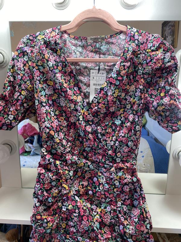 Сукня міні в квітковий принт,Stradivarius тканина котон рукавичики ліхтариками як на фото ,актуальний фасон ,спідничка з оборкою, дуже красива та яскрава вживу на 2 фото реальний колір(принт)в розмірі S та піде і на маленьку М(тягнеться в талї та по бедрах)!В бедрах та талії повинно бути вільніше тоді вона виглядатиме ще гарніше!( мені мале,)