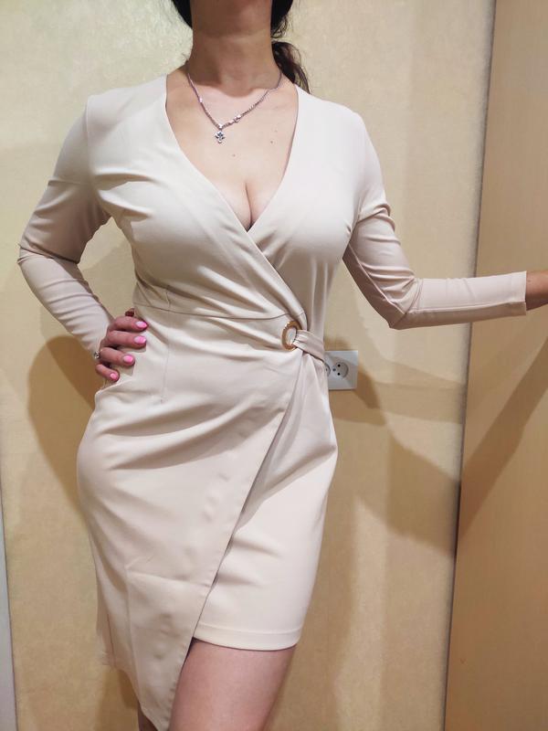 Красивое бежевое платье с декольте и оригинальной юбкой. Новое, с ценником. Размер 46 , хорошо тянется.