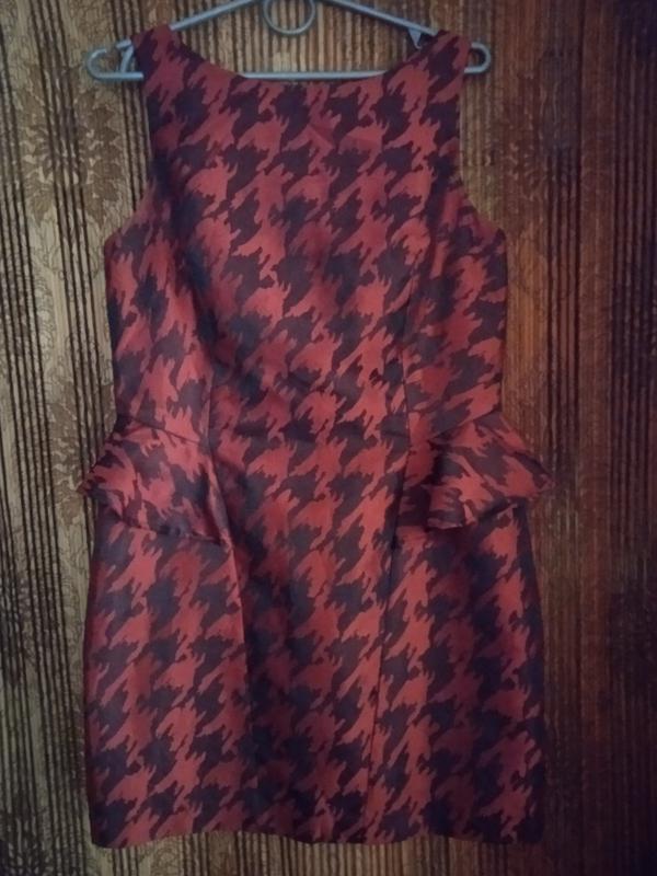 Стильне плаття від NEW LOOK, красивий великий візерунок "гусяча лапка" в червоно-чорному кольорі з шовковистим відливом. На спинці велика акцентна застібка - блискавка в бронзовому тоні. Плаття на підкладці, добре тримає форму. Розмір: UK 12, EUR 40. Склад: 100% поліестер, підкладка-100% поліестер.