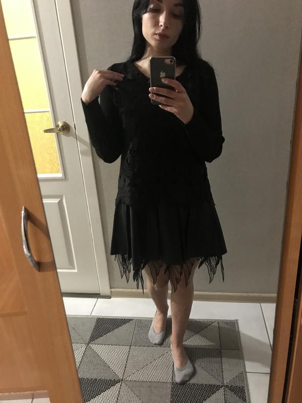 Очень стильное платье низ под кожу( очень хорошего качества) , верх гипюр и вязаные рукава. На тёплой подкладке. Очень приятное к телу, можно зимой носить .