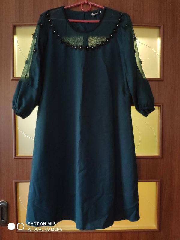 Сукня трапеція темно зеленого кольору. Оздоблена біля горловини і на рукавах сіточкою та романтичними квіточками. Тканина креп діагональ. Дуже гарна і романтична. Може скрити недоліки фігури. ПОГ 50 см. Довжина 95 см