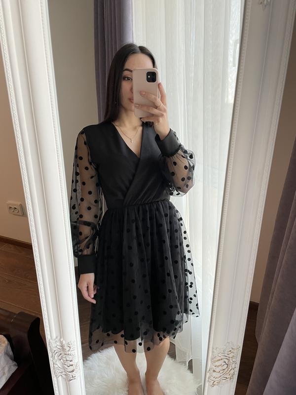 Платье с V образным вырезом Рукава и юбка фатин Юбка : костюмка + сверху фатин в горошек На выход не одевалось ,только примерка дома Одето на рост 160 см. Все замеры скину в лс Смотрите все мои объявления,разгружаю гардероб за символическую цену 👌🏻