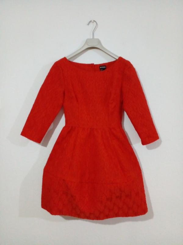 Розмір вказано С,36, але тканина не тягнеться,тому ваші мірки мають бути меншими за мірки сукні. плечі-38 пог-42 пот-33 поб-60-65( вільно) рукав-44, біцепс-15.пройма-19 довжина-82-85( дивлячись як міряти) є пару маленьких затяжо,показала на фото. на підкладі,спідниця 2.В боковому шві є замок.