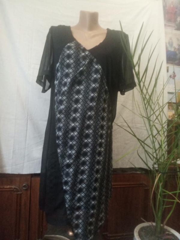 Платье короткое,боковое потайная молния, низ асимметричный на подкладке. П.о.г.- 60 ширина плечей - 41 длина рукава - 27 п.о.т.- 57 п.о.с.- 64 длина - 98 Ткань легкая, тонкая.Узор из переда, если бы, изящна фигура, бедра.С переда низ не ровный, с левой стороны клин удлинение.Спинка -низ ровный.