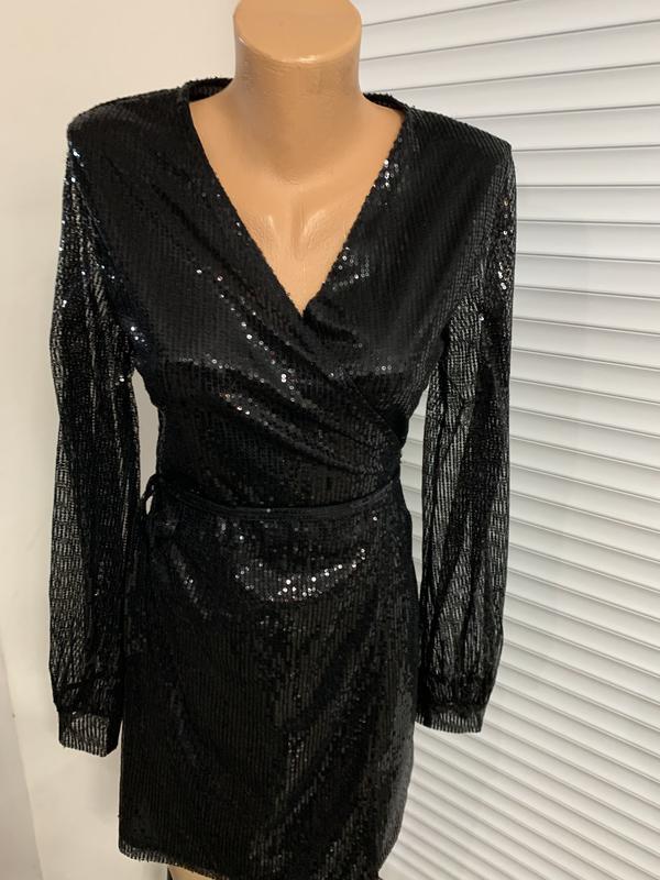 Ткань-паетки.Оукав прозрачный с паетками.Последний размер Фассон на запах.Застежка на поясе на запах.Размер СКоротеое выше колена.