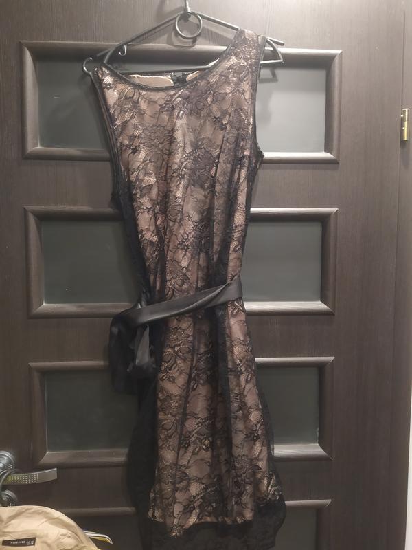 Ажурное бежево-черное платье с атласным поясом до колен. Размер: М. За дополнительной информацией/фото обращайтесь в личные сообщения. Отправка НП, Укрпошта за счёт покупателя или самовывоз в районе м.Лесная (Киев).