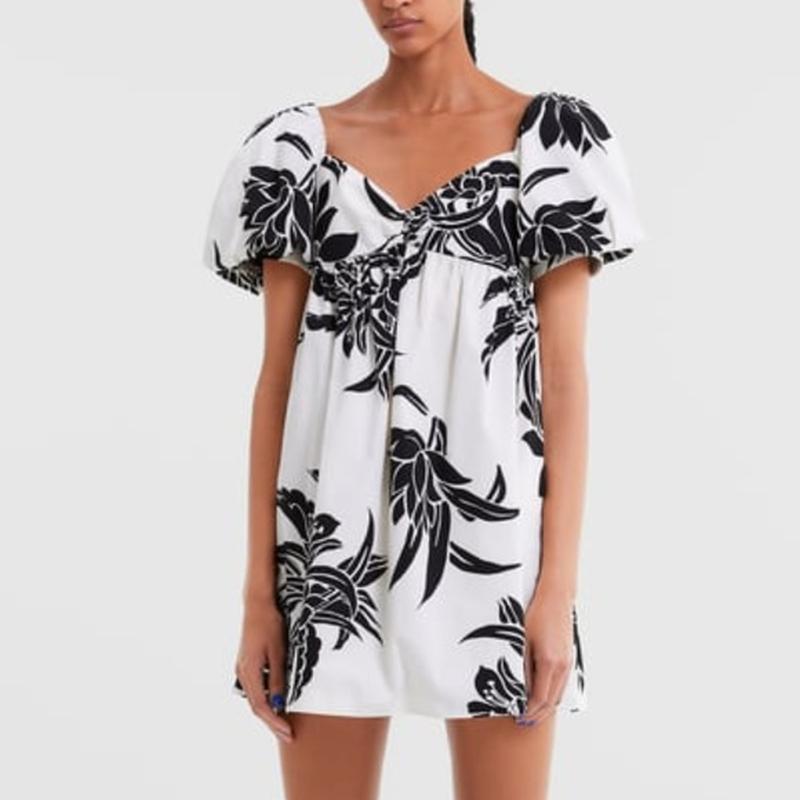 Мини-платье Zara с цветочным принтом, трапециевидной формы, прямым вырезом и короткими рукавами-фонариками, потайными боковыми карманами в швах, эластичной присборенной деталью сзади. длина от верха груди к низу 67 см Если от плеча то длина 77-82 см так как рукав на резинке Полуобхват груди 41 см и тянется до 44 см Прлуобхват талии там где шов 38 см и тянется до 41 см
