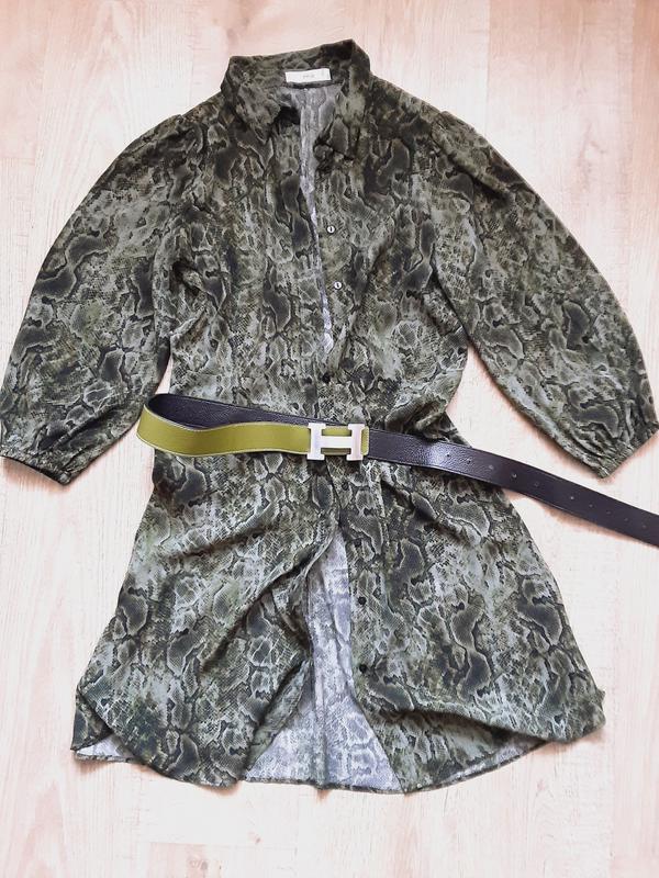 классное струящееся платье-рубашка,змеиный принт,пог 47смпот 40см,длина рукава49см,плечи35см,длина 90смв жизни более зеленый цвет,фото немного искажает,вискоза,не ношено,ремень не продается