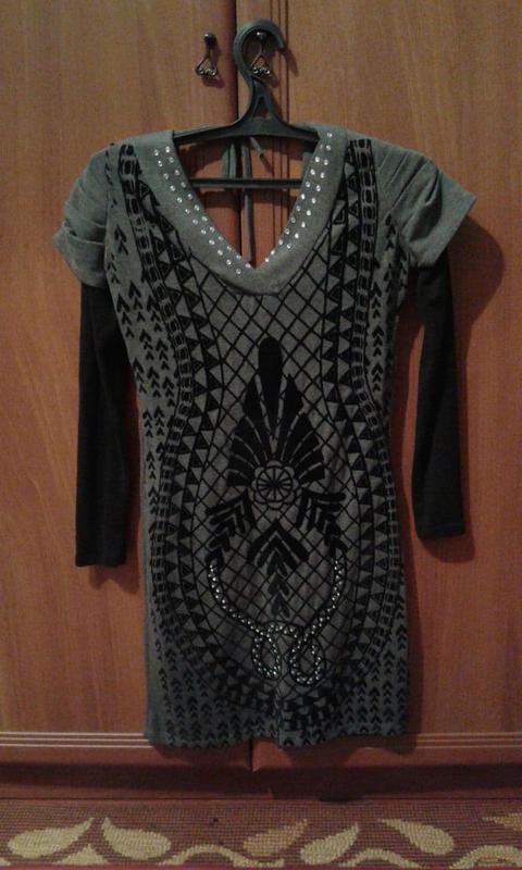 Платье трикотажное,с апликацией "под замш",короткое,садится по фигуре, пойдет на р.44-46.Цвет-серо-черный.В отличном состоянии