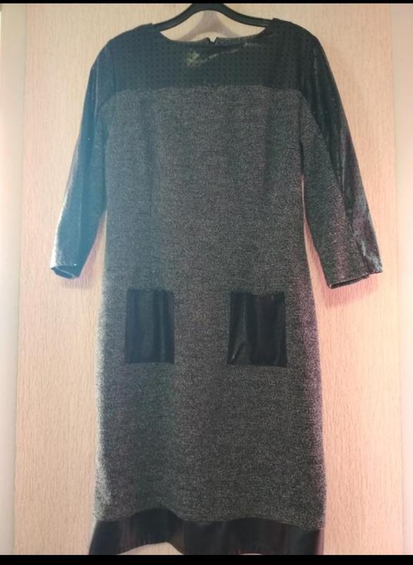шикарное теплое платье , со вставками ЭКО кожи , сзади на молнии. размер L, длина рукава 42, пог 90, поб 96, длина 92.