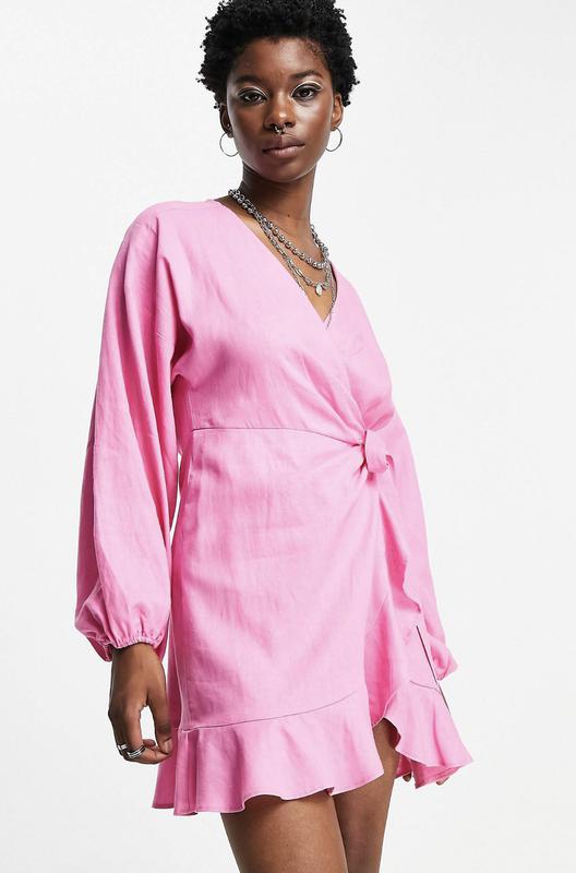 В наличии новое Льняное ярко-розовое платье мини на запах и объемными рукавами Topshop. Будет на невысокий рост. Размер Xs-S. 54% лён, 46% вискоза.
