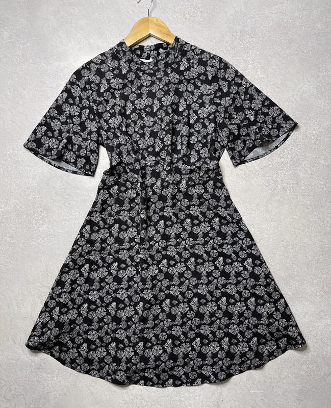 Легкое платье с рисунком . Воротник - стойка застегивается на две пуговицы . На спинке молния . Состав: верхнее платье 98 % полиэстер , 2% эластан . Подкладка 100% полиэстер Размер : eu 38 на наш 46 М Производитель : H&M (отсутствуют бумажные магазинные этикетки , вещь сток - новая одежда из Европы. Не секонд ,запах нового ).