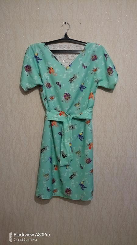 Платье светло - бирюзового цвета с интересным принтом(птицы). Свободного кроя. Ткань не просвечивает, тянется. Есть пояс, но можно и без пояса. Длина 96 см. ПОГ 49 см. ПОТ 47 см. ПОБ 52 см. полуобхват по низу 59 см.