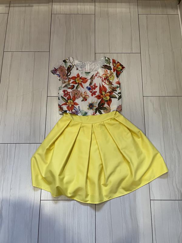 Очень красивое платье с атласной жёлтой юбкой и цветным топом