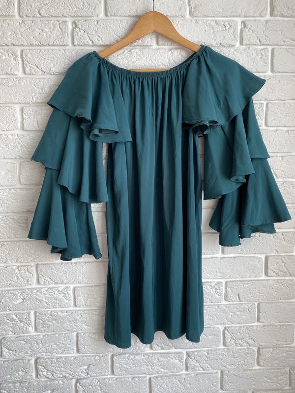 Як нове, розмір с-м, колір зелений, за рахунок резинки зверху можна одягати як на плечі так й поиспускатиприспускати, красиві рукави, плаття шовкове, дуже легенька, виглядає дуже гарно