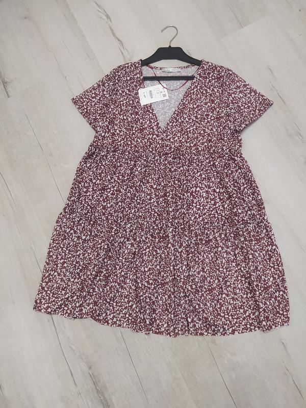 Легкое летнее платье бордового цвета с белыми вкраплениями. Материал: 99% полиэстер, 1% эластан. Розмір на бірці L. ⚡Длина изделия - 80 см. ⚡Ширина плечей - 37 см. ⚡ПОГ - 50 см. ⚡Длина рукава - 19 см. В талии платье свободное, от груди идет каскадом.