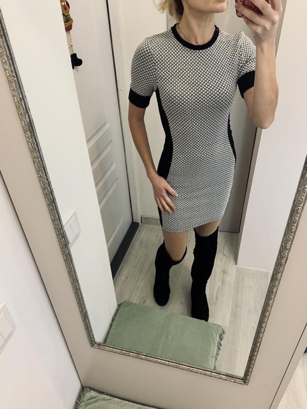 Плаття підкреслює фігуру завдяки чорним вставкам з боків. Розмір хс-с. Довжина 80 см. Рукав 23см. Добре тягнеться , зручне і тепле. Стан дуже хороший.