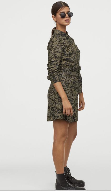 Короткое платье-рубашка из вискозной ткани с набивным рисунком. Воротник и потайная застежка спереди. Съемный пояс на талии. Длинные рукава с узкими манжетами на застежке. Кокетка сзади. Слегка скругленный нижний край. Размер М-Л