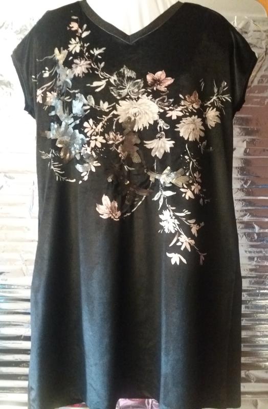 легкое, впереди велюр с рисунком, сзади трикотаж, стрейч. ПОГ до 55. ПОТ до 53. ПОБ до 58. длина 86