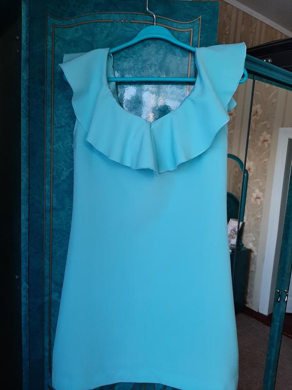Плаття бірюзового кольору з цупкої тканини, не просвічується. Довжина виробу 86, ПОГ 44-45.