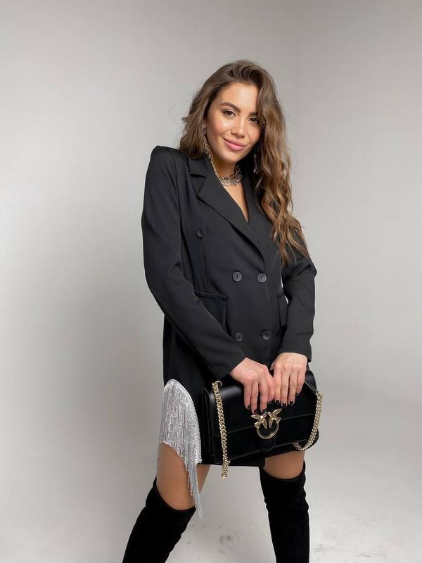 🔔атр 850-049 Платье пиджак с бахромой Размеры: 42-44, 46-48 Цвет: чёрный Ткань: костюмка класса люкс+ бахрома Стильное платье, приталенное, застёгивается на пуговицах, с плечиками. Длина 82 см.