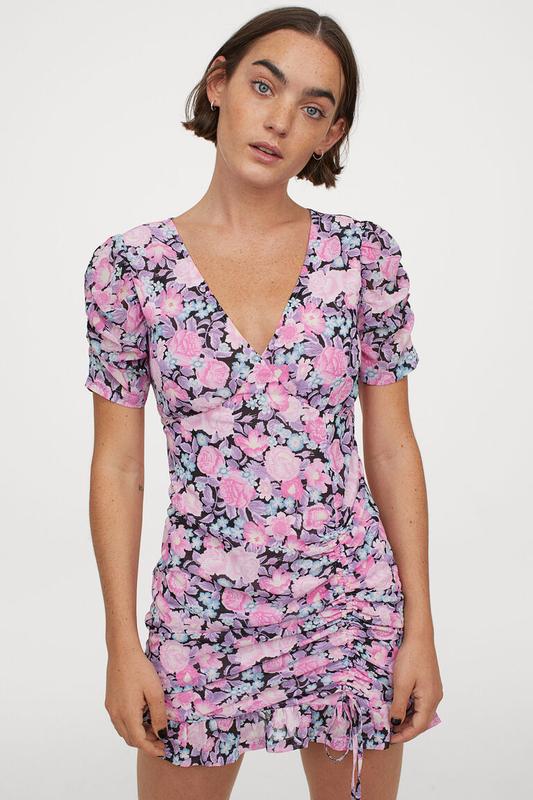 Короткое узкое платье из шифона из переработанного полиэстера с треугольным вырезом горловины, швом под бюстом и короткими присборенными рукавами. Кулиска спереди на юбке для создания эффекта драпировки и короткая оборка снизу. На подкладке. Размер 36 ПОГ - 47 см ПОТ - 41 см ПОБ - 46 см Длина - 90 см Состояние новой вещи, без этикетки