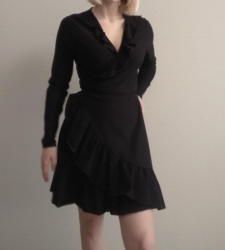 маленькое чёрное платье на запах с оборками, обхват груди на фото 89 можно и до 94см, обхват талии на фото 64 можно до 75см, длина 90 см