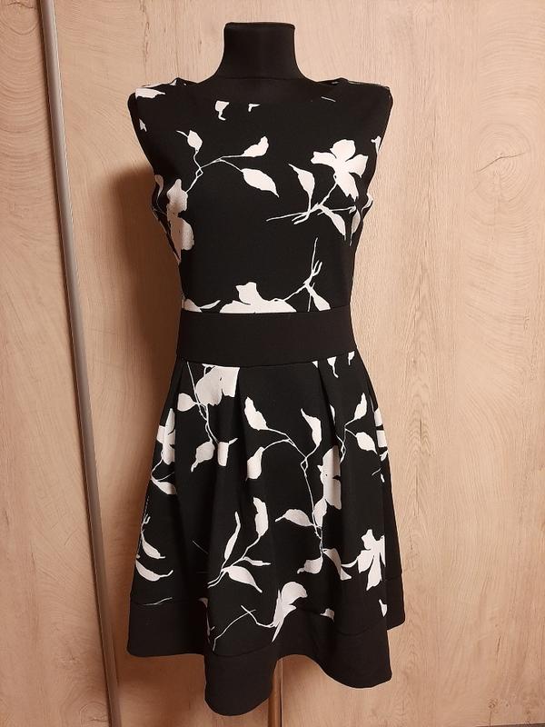 Сукня з ніжними квітами. Приталий крій, , круглий виріз, довга блискавка по спині. Тканина трикотаж, тягнется, гарно сідає по фигурі: поліестер 95%, еластан 5%. Размер S,M. Замер: плечи 33см, пог 41см, длина 83см, длина верха 37см, длина юбки 46см, пот 35см.