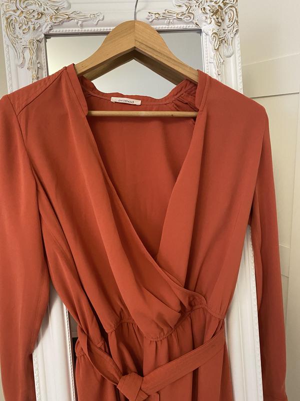 Дуже красива сукня з імітацією запаху, гарно лежить на грудях, середньої довжини. Тканина дуже приємна, гарно лежить і тримає форму. Є додаткова кнопка щоб зменшувати виріз. Колір як на фото