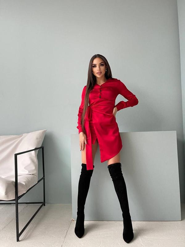 👑Женское платье 👒 0484 Женское атласное платье из мягкого шелка, с V-образным вырезом и длинным рукавом, Короткое мини-платье с запахом Размеры: 42, 44, 46, 48 (размер больше/меньше +50 гривен за градацию) Ткань: шёлк армани