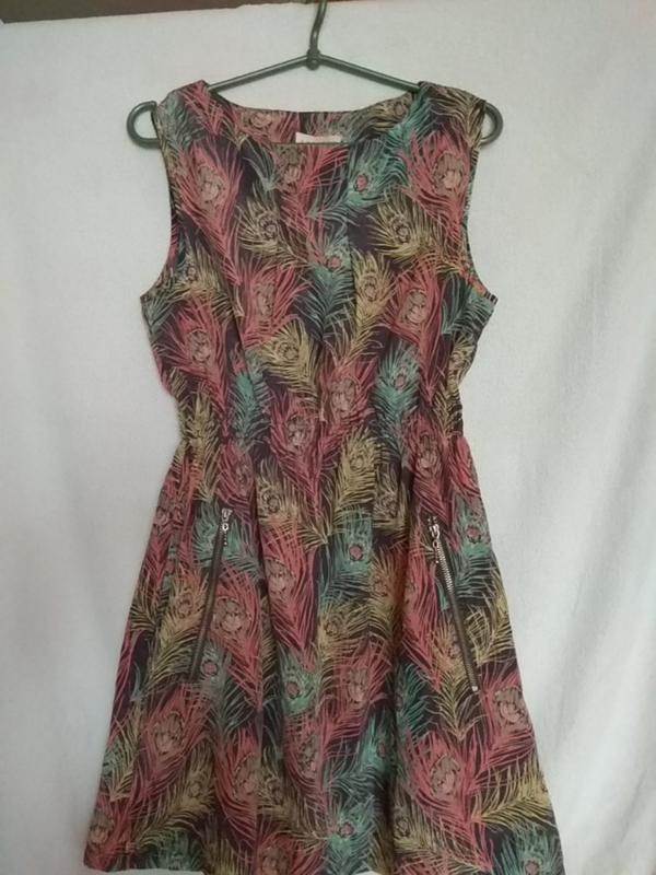 Очень нежное красивое летнее платье без рукавов в пастельных тонах. Лёгкая, струящаяся, немнущаяся ткань. Спереди карманы на замочках. Слегка расклешенное. Плечи 38 см. Пройма 22 см. ПОГ-ПОТ-ПОБ 46-32-54. В поясе резинка, при растягивании ПОТ до 46 см. До талии 36 см, длина юбки от талии 50 см. Состояние новой вещи.