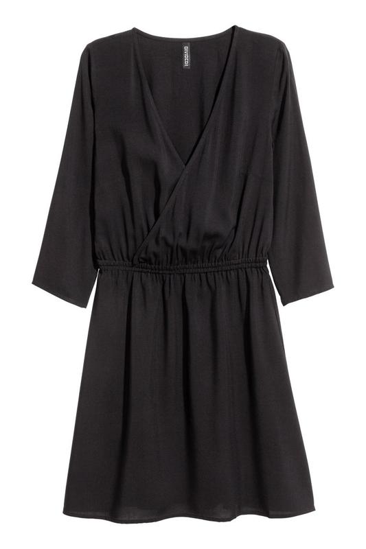 H&M Короткое тканое платье. На платье запах сверху с потайной кнопкой. Рукава длиной три четверти. Отрезная модель с резинкой на талии. Без подкладки. Состав: Вискоза 100% Размер: 34/8