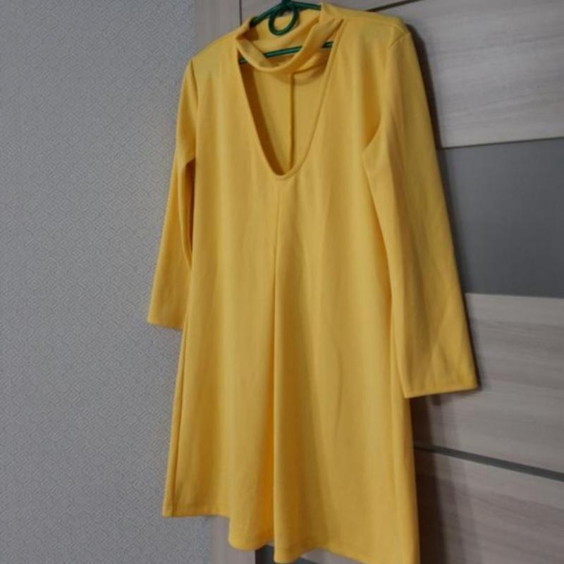 Яркое платье жёлтого цвета с чокером и рукавом 3/4.