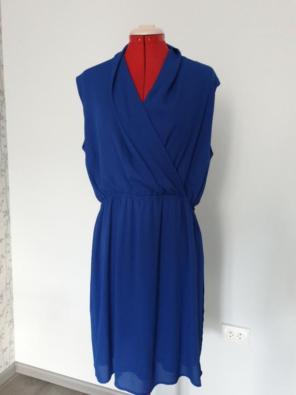 Стильное платье, без рукавов, красивого синего цвета, на запах в верхней части, v образный вырез, на груди небольшой хомутик, пог 52см, длина 100 см, состав и размер на фото, сток