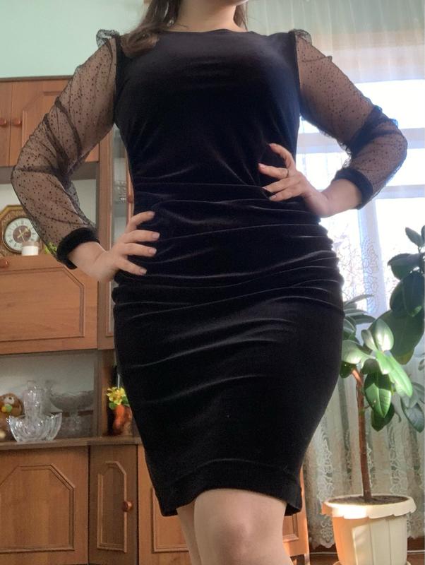Бархатное платье-футляр. С драпировкой в зоне живота. Сделает проблемную зону красивой и все аккуратненько скроет. Длина чуть выше колена. Шифоновый рукавчик. Состояние идеальное, надевала 1 раз.