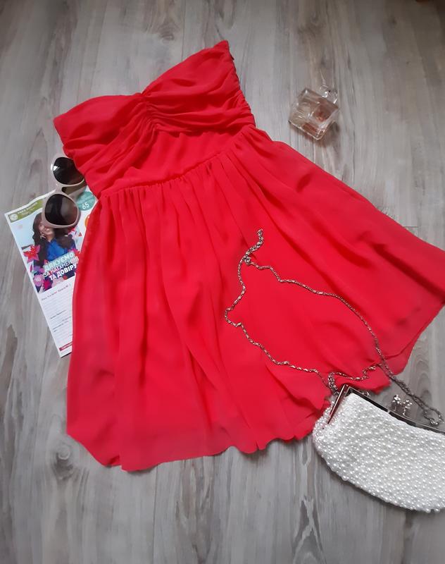 яскраве коктейльне плаття,бретелі відсутні.Тканина без зацепок і т.д.Ідеально з чорним подовженим піджаком оверсайз