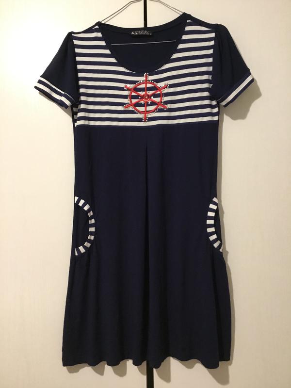 Трикотажное платье с карманчиками с морской тематикой, размер М в отличном состоянии. Замеры : Плечи - 34 см; Под мышками - 38 см; ПОБ - 44 см; Длина - 83 см; Ширина внизу - 66 см;