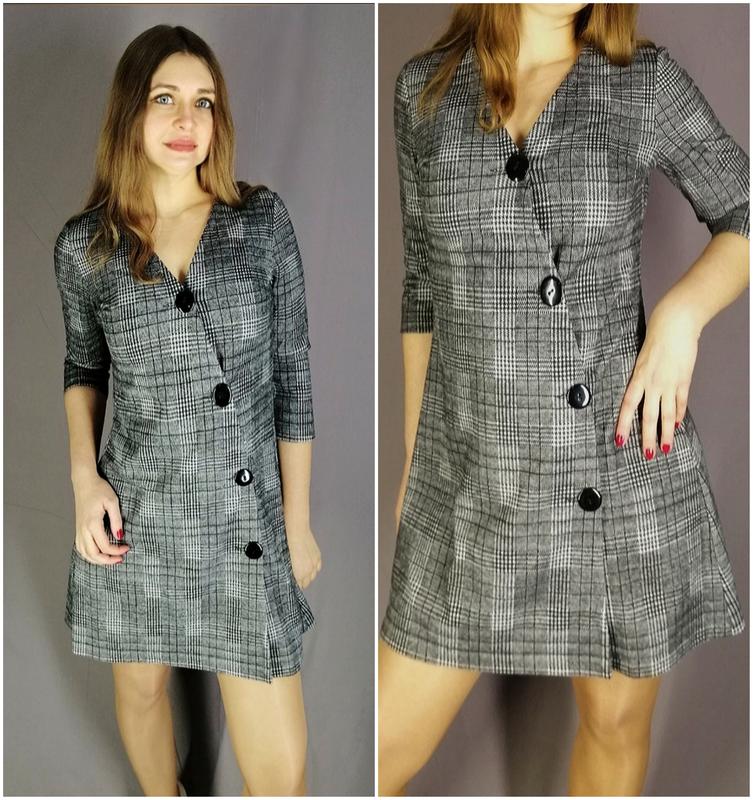 Модное короткое платье в клетку. Расцветка серого цвета. Спереди по всей длине застегивается на чёрные пуговицы по диагонали. Рукав 3/4. От груди вниз сидит свободно. Производство Украина. Фото реальные. Размер: 48 Замеры: Длина: 85 см Длина рукава: 44 см 1/2 объёма плеч: 42 см ПОГ: 49 см ПОТ: 45 см ПОБ: 54 см.