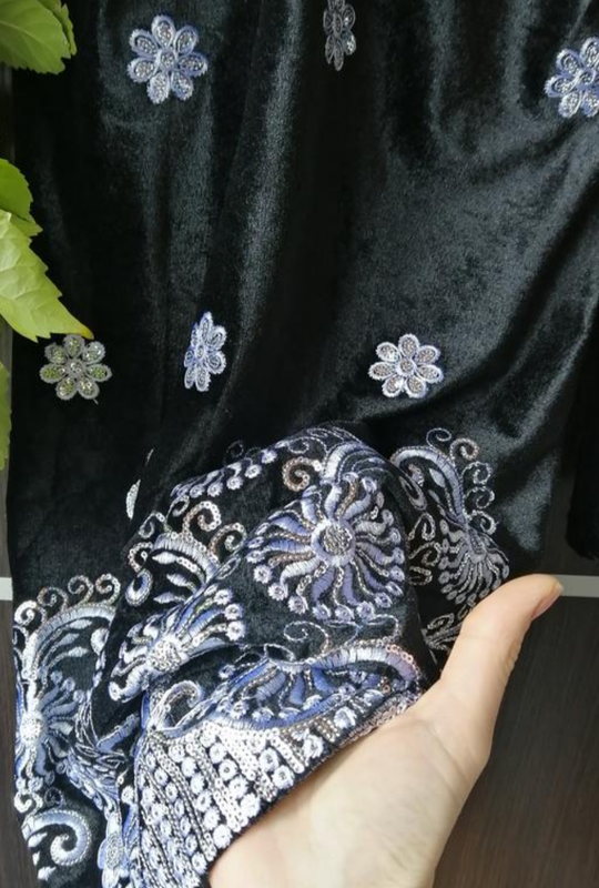 Очень красивое платье. Стан идеален. Эффектов и следов ношения нет. Выглядит как новое. Рукав расширен к низу, модель платья трапеции. Белые цветы обшиты блестками. Ткань мягушка, приятная к телу, под велюр. Цвет - насыщенный черный. Сбоку замочек. Очень хорошо тянется. На бірці розмір uk 10,evr38. Отправка сразу) Если нужно замеры - пишите.