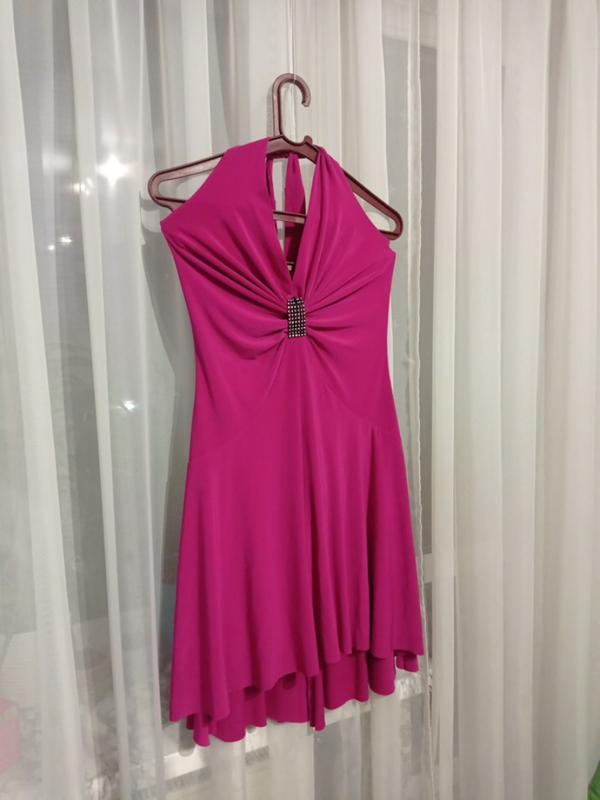 насичене рожеве літнє плаття. зав'язується на шиї. без чашечок на груди від талії до низу вільний крій пог 34 на 8-10 см тягнеться пот 32 так само тягнеться поб вільно до 42 далі в натяжку перед коротший довжина від грудей 72. але регулюється на шиї. тому залежить від грудей зад довший на 7 см так само залежить від того як завяжеться