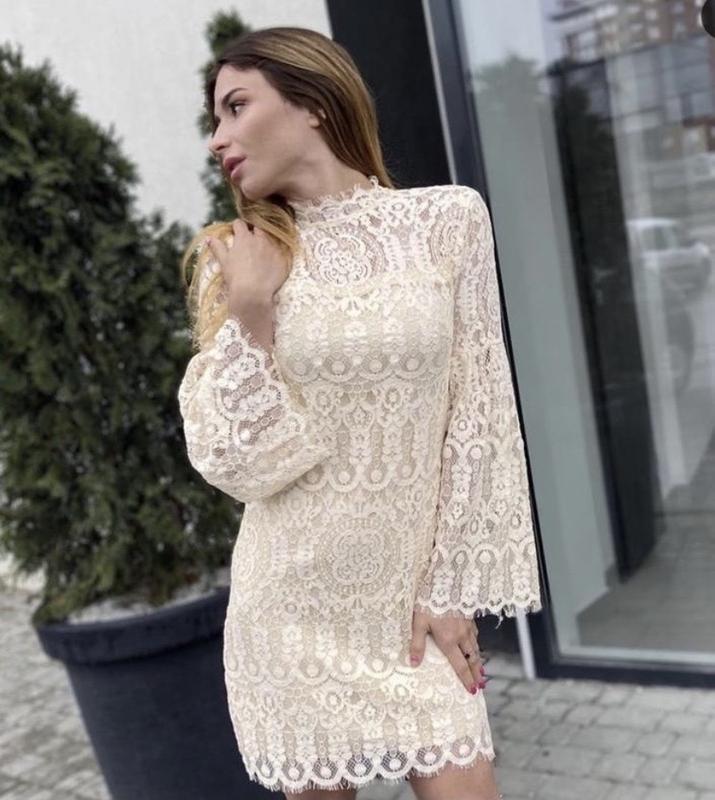 Ажурне якісноа сукня молочного кольору з гарними рукавами.