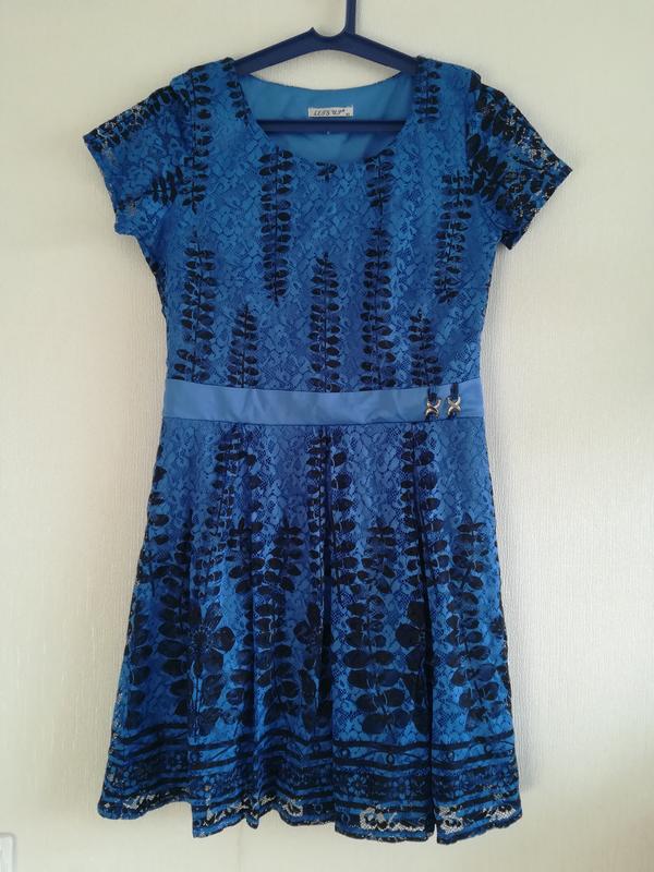 Сукня синього кольору, з рослинним орнаментом, знизу підкладка, є місце для пояска, в ідеальному стані, без жодних дефектів.
