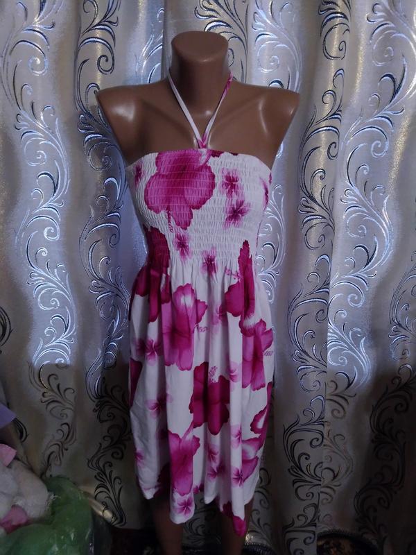 Очень красивое летнее платье с цветочным принтом. Верх полностью на нитках-резинках. Замеры: ПОГ 28-57 см, ПОБ 64 см, длина (без учета завязки) 74 см. Ткань - вискоза. Все ярлычки срезаны. В идеальном состоянии