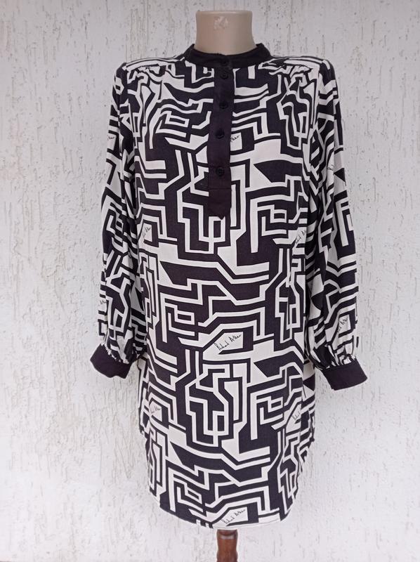 Отличное платье свободного кроя, рисунок абстракция, вискоза. Длина по спинке 82, ПОГ 54, рукав 57, плечи 38.