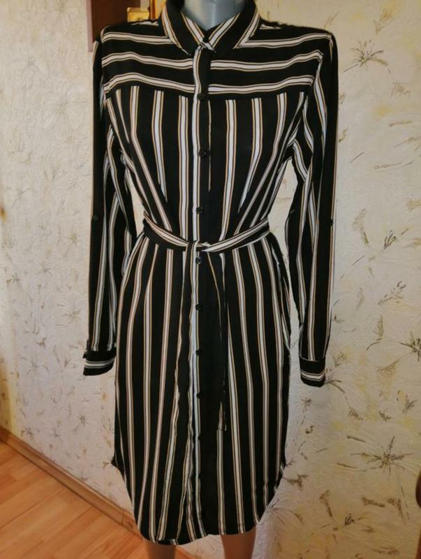 Евро размер 36, смотрите замеры. Состояние отличное, без дефектов. Ткань средней плотности, не просвечивает, не тянется, 100% полиэстер. Цвет основной черный. Длина от верхней точки плеча к низу 98. Длина рукава от плечевого шва 60. П/о бицепса 17. П/о груди 47. П/о талии 48. П/о бедер 50. Ширина между плечевыми швами 40. 56