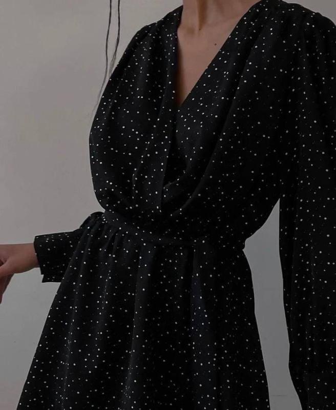 Невесомое платье Мод 50МА Размер 42-46 универсальный Ткань - супер софт Цвет - как на фото, в горошек Супер женственное платье на запах Идеально для свидания, от вас будет не оторвать взгляд в таком платье На рукавах пуговицы, на талии лёгкая резинка, длина - 83 см