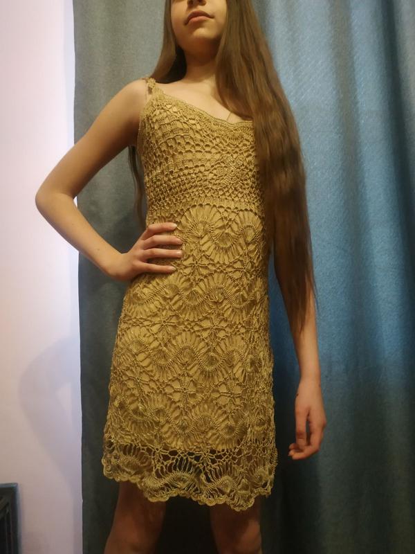 золотисте вязане плаття на підкладці, не просвічується . нитка тягнеться. Nikowa відомий європейський бренд .ціна була вища за 100 євро. одягнено на підлітка зріст 170. довжина виробу 85 регулюється. напівобхват грудей 45+тягнеться, талія 33, тягнеться, бедра 40 , тягнеться до 50 . стан нового , без нюансів. одягнено раз. тканина віскоза з додаванням металевої нитки, гарно блистить