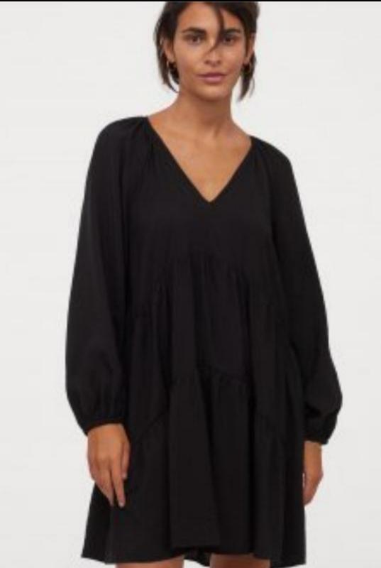 Плаття-трапеція з тканого матеріалу з смесовой віскози. Трикутний виріз і довгі широкі рукави реглан з вузькою гумкою знизу. Асиметричні шви зі складанням для додаткового обсягу. Без підкладки. Розмір Л,можна на М-L довжина 89 см. пог 55 см.