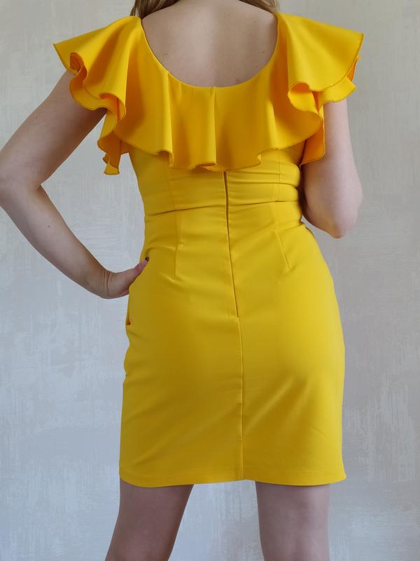 Сукня красивого жовтого кольору. Тканина не дуже тягнеться, але м'яка і приємна до тіла. Ззаду є прихована блискавка. Збоку кишеньки. Розмір 38( додаткові заміри на вимогу) Одягала 1 раз на захід