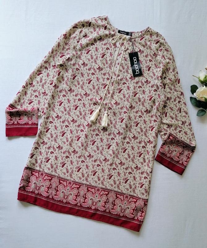 Плаття туніка від Boohoo. Розмір 12 (наш 48). Склад 100 % віскоза. Заміри : довжина по спинці 80 см, ПОГ 50 см, ПОТ 50 см, ПОБІДИ 53 см, плечі 9 см, довжина рукава 59 див. Стан нове з бірками.